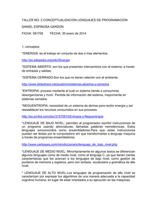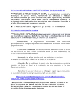 El documento presenta una lista de conceptos clave relacionados con lenguajes de programación, incluyendo diferencias entre programación estructurada y orientada a objetos. También incluye un ensayo que contrasta estas dos aproximaciones, señalando que la programación estructurada se enfoca en la organización mientras que la orientada a objetos agrupa conjuntos de variables relacionadas en objetos.