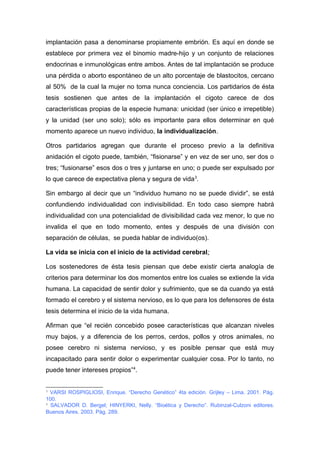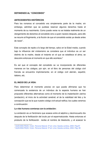 El documento define el concepto de "concebido" y analiza las diferentes teorías sobre el inicio de la vida humana. Explica que los romanos consideraban al concebido como parte de la madre, mientras que en la Edad Media se le veía como un ser distinto. Luego resume las principales teorías sobre el inicio de la vida: la implantación, la actividad cerebral, la viabilidad del feto y la concepción. Finalmente, analiza las teorías jurídicas que han definido la naturaleza del concebido a lo largo de la historia: la portio