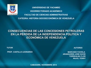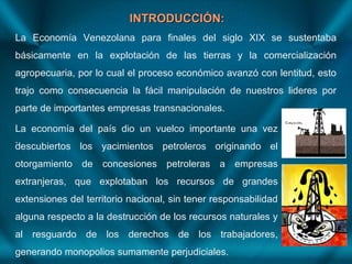 Este documento analiza las consecuencias de las concesiones petroleras otorgadas a empresas extranjeras en Venezuela desde principios del siglo XX. Estas concesiones llevaron a la pérdida de la independencia política y económica del país al concentrarse la economía en la industria petrolera controlada por intereses externos, afectando el desarrollo de otros sectores como la agricultura.