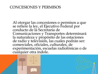 Este documento describe las regulaciones para concesiones y permisos de estaciones de radio y televisión en México. Establece que las concesiones son para estaciones comerciales y requieren ciudadanía mexicana, mientras que los permisos son para estaciones oficiales, culturales u otras no comerciales. También detalla los términos y condiciones incluidos en las concesiones y permisos, así como las causas de nulidad, caducidad y revocación.