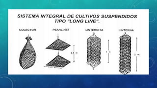 Este documento trata sobre la concha de abanico (Argopecten purpuratus), incluyendo su taxonomía, morfología, características ambientales, reproducción y cultivo. La concha de abanico se distribuye geográficamente desde Nicaragua hasta Chile y vive en aguas costeras entre 5-30 metros de profundidad. En Perú existen varios bancos naturales de esta especie, y se cultiva principalmente en zonas de Ancash, Lima, Pisco y Piura. Su cultivo consiste en la reproducción de larvas en hatcheries