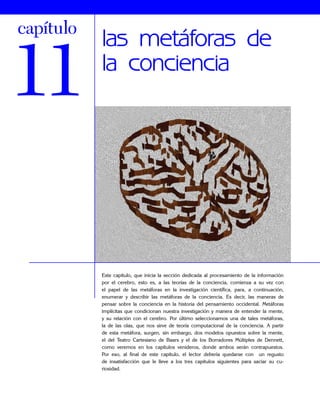 Este documento describe el papel de las metáforas en la investigación científica de la conciencia. Explica que las metáforas son herramientas necesarias para estudiar conceptos abstractos como la conciencia que no pueden definirse de forma literal. A continuación, resume varias metáforas comúnmente usadas para estudiar la conciencia, incluyendo la metáfora del foco de linterna.