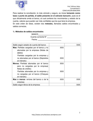 La conciliación bancaria es un proceso mediante el cual una empresa confronta los movimientos y saldo de una cuenta bancaria registrados en sus libros contables con la información provista por el extracto bancario, con el fin de identificar diferencias y realizar los ajustes necesarios. Esto implica revisar cheques girados, depósitos, notas de débito, notas de crédito y errores, ya sea de la empresa o el banco, para determinar la causa de cualquier discrepancia entre los saldos.