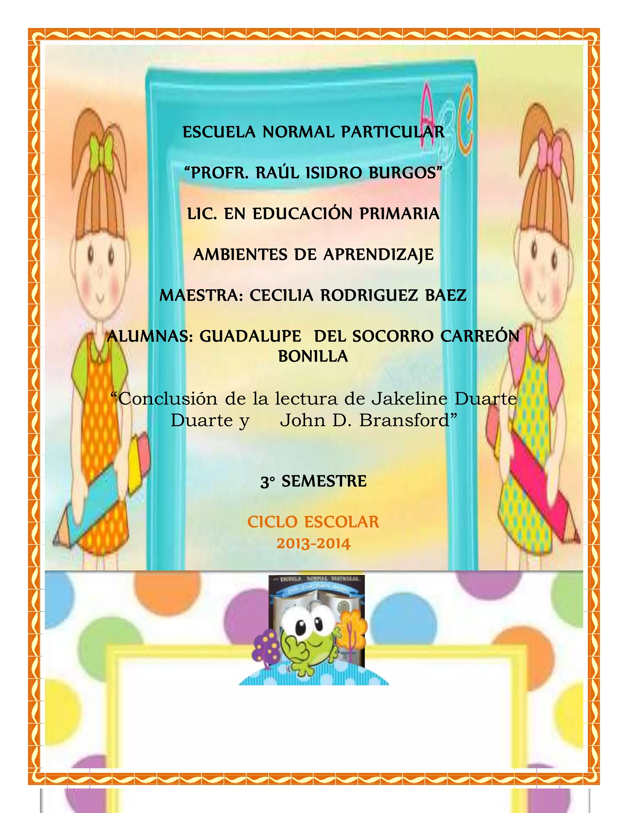 El documento reflexiona sobre la importancia de crear ambientes de aprendizaje efectivos en el ámbito escolar, destacando que estos van más allá del espacio físico y necesitan considerar el estado emocional y las experiencias previas de los estudiantes. La autora enfatiza el papel del maestro como mediador que debe facilitar un entorno lúdico que fomente el deseo de aprender y la participación de los alumnos. Finalmente, se subraya la responsabilidad del educador de despertar el interés por el saber, utilizando estrategias pedagógicas adecuadas para todos los estudiantes.