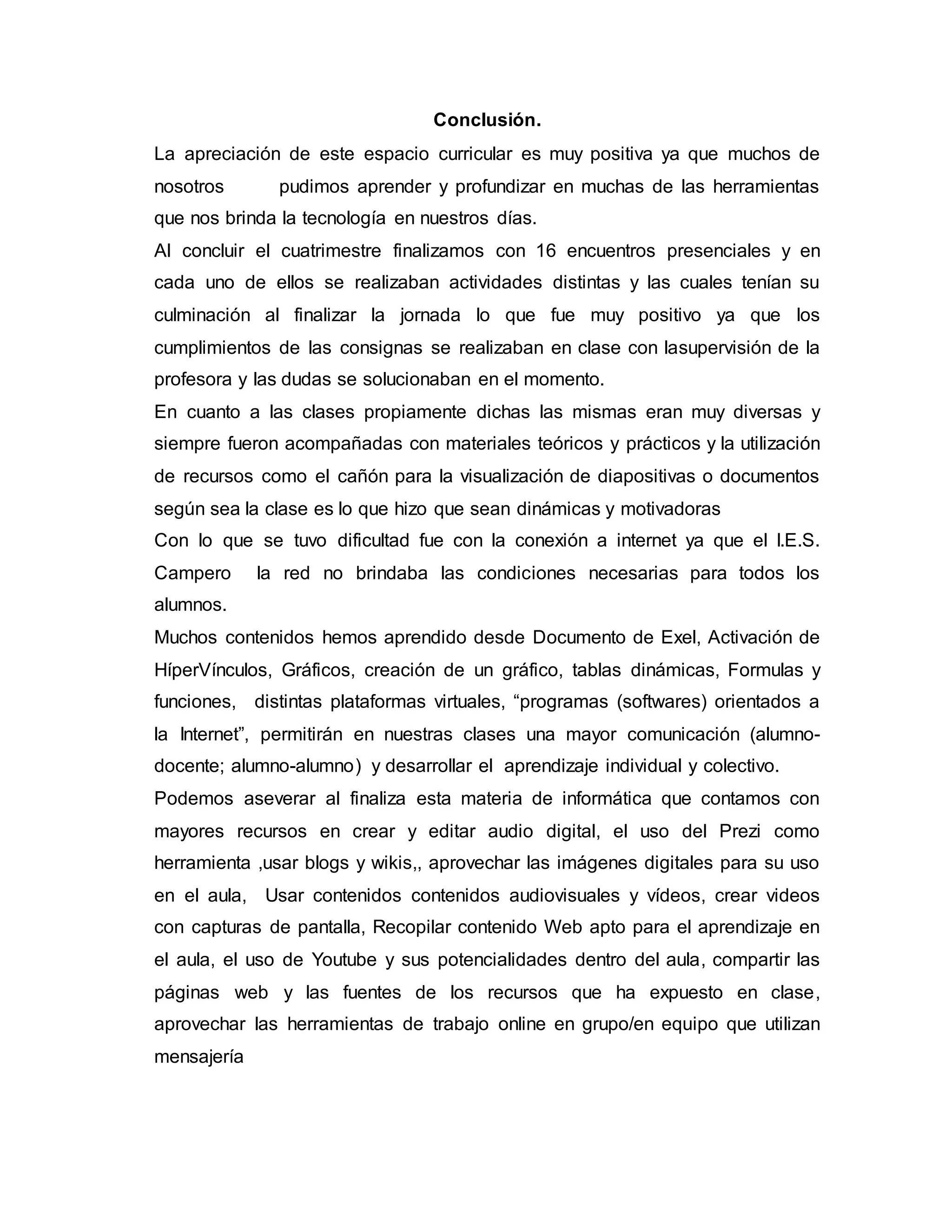 El documento resume la apreciación positiva de un espacio curricular en el que los estudiantes pudieron aprender y profundizar en herramientas tecnológicas. Las clases incluyeron 16 encuentros presenciales con actividades diversas y materiales teóricos y prácticos. Si bien hubo dificultades con la conexión a internet, los estudiantes aprendieron sobre varios programas y plataformas que permitirán una mejor comunicación y aprendizaje.