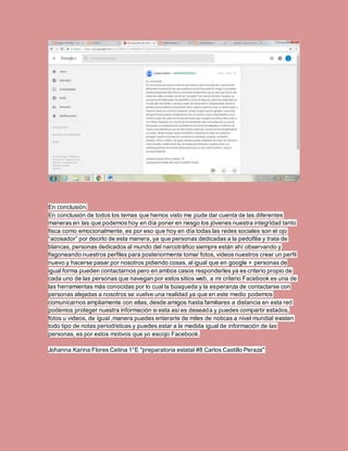 El documento resume los temas vistos sobre cómo los jóvenes pueden poner en riesgo su integridad física y emocional en las redes sociales. Explica que las redes sociales son un medio para que personas como pedófilos y traficantes observen los perfiles de los usuarios. Además, señala que Facebook es una de las herramientas más conocidas que permite comunicarse con amigos y familiares distantes, compartir información de manera protegida, y mantenerse informado sobre noticias mundiales y de conocidos.