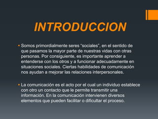 Este documento trata sobre la comunicación eficaz y los elementos que la facilitan. Define la comunicación eficaz como aquella que logra transmitir el objetivo del mensaje tomando en cuenta factores como la claridad, precisión, objetividad y oportunidad. Explica técnicas como la escucha activa y barreras como las físicas, semánticas y personales que dificultan la comunicación. Concluye que para lograr una buena comunicación eficaz se debe aplicar estos factores, elementos y técnicas, mostrando interés, superando barreras y