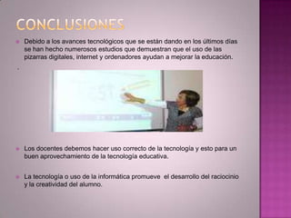 El documento discute los beneficios del uso de la tecnología educativa, incluyendo pizarras digitales e internet, para mejorar la educación y promover el desarrollo del pensamiento crítico y la creatividad de los estudiantes. También señala que la tecnología puede ayudar a los maestros a lograr objetivos más rápidamente y fomentar una mayor participación estudiantil.