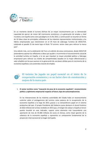 El documento resume las 10 ideas clave del VII Foro de Liderazgo Turístico de Exceltur sobre el turismo como sector clave para reforzar la marca país. Se reconoció el papel esencial del turismo en la recuperación económica española y como factor para mejorar la marca país. También se destacó la necesidad de estrategia, liderazgo político y visión transversal para el sector, así como modelos de gobernanza público-privada. Prioridades para 2014 incluyen reducir el IVA turístico, inyectar