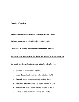 Este documento resume las conclusiones de un análisis de la Declaración Mundial sobre Educación para Todos. Se identificaron las palabras más frecuentes en los 10 artículos, como escritura, comunicación, equidad y educación básica. Las menos mencionadas fueron trasmisión de cultura, nutrición y evaluación. El autor concluye que la trasmisión y el respeto por la cultura son fundamentales para los procesos educativos y que los modelos económicos y políticos deben construirse desde la unidad, la identidad cultural