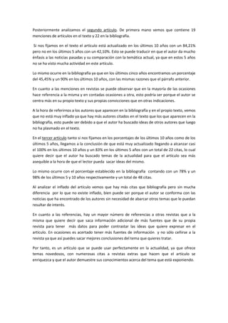 El documento analiza cuatro artículos académicos y resume sus características principales. El primer artículo tiene un texto actualizado pero una bibliografía anticuada e inflada. El segundo artículo está actualizado en los últimos 10 años pero no en los últimos 5, y se centra más en el propio texto que en otras fuentes. El tercer artículo está muy actualizado y cita numerosas revistas externas. El cuarto artículo está actualizado tanto en citas como bibliografía, aunque se centra más en noticias pasadas; presenta un leve aumento en