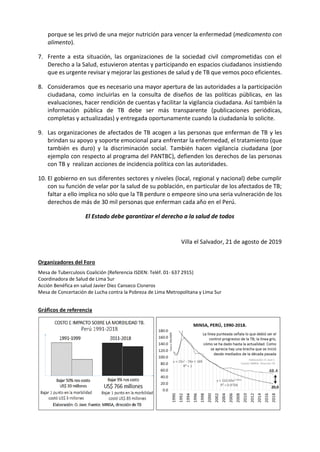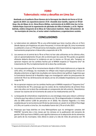 El foro sobre tuberculosis en Lima Sur, realizado el 21 de agosto de 2019, destacó la insuficiencia de avances en el control de la enfermedad a pesar de un aumento presupuestal significativo. Se identificaron preocupaciones sobre el incremento de costos de medicamentos y la falta de una adecuada búsqueda de casos no diagnosticados. Las organizaciones civiles pidieron mayor participación ciudadana y transparencia en las políticas de salud relacionadas con la tuberculosis.