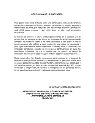 El documento destaca la importancia de la innovación constante para que las compañías sobrevivan a largo plazo y permanezcan competitivas. Explica que el cambio es inevitable y que las empresas deben estar dispuestas a cuestionar sus propias ortodoxias y estrategias para definir nuevas formas de hacer negocios. También señala que la innovación puede tomar diferentes formas como nuevos productos, procesos o modelos de negocio y organización, y que los administradores deben crear una infraestructura que fomente y apoye la innovación