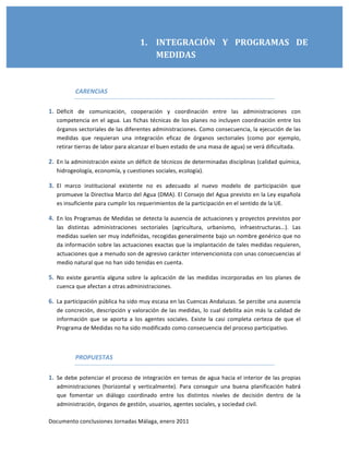 Las jornadas de Málaga sobre la planificación hidrológica en Andalucía evidencian carencias en la comunicación y coordinación entre administraciones en la gestión del agua, así como insuficiencias en la participación pública y en el análisis de costes asociados. Se proponen mejoras como el fomento del diálogo interadministrativo, la inclusión de medidas de consulta pública y la necesidad de descripción detallada de los costes y alternativas en el programa de medidas. Además, se destaca la importancia de priorizar la recuperación de costes y de integrar la gestión de las aguas superficiales y subterráneas.