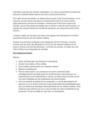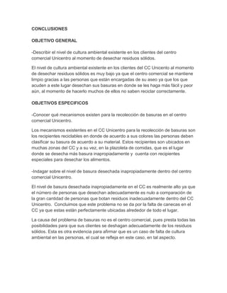 Este documento resume las conclusiones de un estudio sobre el nivel de cultura ambiental de los clientes de un centro comercial al desechar residuos sólidos. El nivel es muy bajo debido a que la mayoría de personas no reciclan correctamente o tiran basura en cualquier lugar. Los jóvenes son los que más conocen sobre reciclaje, mientras que los adultos carecen de educación ambiental. Los días y lugares con más basura son los fines de semana y la hora del almuerzo en la plazoleta de comidas. El problema se debe a falta de cultura