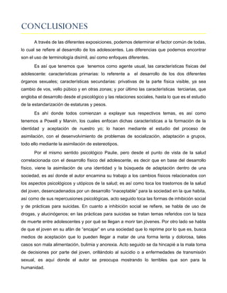 Este documento resume las conclusiones de varias exposiciones sobre el desarrollo de los adolescentes. Resalta que los autores se enfocan en las características físicas, psicológicas y sociales de los adolescentes, incluyendo cambios en el cuerpo, formación de identidad, salud mental, y adaptación a la sociedad. También discute factores que influyen en el crecimiento como las hormonas y glándulas, y retos que enfrentan los adolescentes como el inicio de la pubertad de manera abrupta. Concluye que los
