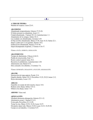 Este documento es una concordancia bíblica temática que lista temas y palabras clave de la A a la X y las referencias bíblicas correspondientes. Proporciona un índice de temas y palabras clave encontradas en la Biblia y las versículos donde aparecen para facilitar la búsqueda y el estudio de pasajes relacionados.