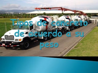 El documento proporciona información sobre el concreto, incluyendo sus componentes (agua, cemento, arena y grava), propiedades cuando está fresco y endurecido, y usos. Explica que el concreto es una mezcla de agregados (arena y grava) unidos por una pasta de cemento y agua, la cual se endurece para formar un material resistente. También describe los diferentes tipos de aditivos que se pueden agregar al concreto para modificar sus propiedades.