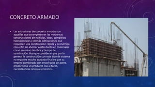 El documento describe el concreto armado, que combina concreto y acero para formar una estructura indivisible. El concreto armado se usa comúnmente en construcciones modernas debido a su rapidez, economía y resistencia. El concreto y el acero son los materiales principales, colocando el acero en áreas de tracción para reforzar al concreto.