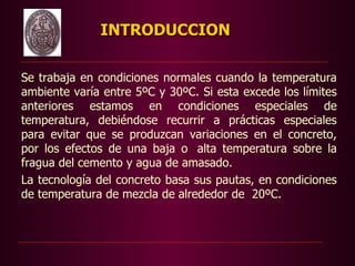 Este documento describe los desafíos y consideraciones para colocar concreto en climas severos. Se define clima caluroso y se describen los problemas potenciales tanto para el concreto recién mezclado como endurecido. Se discuten consideraciones relacionadas a la temperatura del concreto, los materiales cementantes, aditivos, agregados, producción, entrega, dosificación, mezclado, colocación y curado. El objetivo es obtener buenos resultados al colocar concreto en condiciones climáticas extremas.