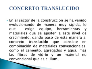 El documento describe un nuevo material de construcción llamado concreto translucido. Se compone de cemento, agregados, agua y fibras de vidrio, además de un material no convencional llamado ilum. El concreto translucido mantiene las propiedades de resistencia del concreto convencional pero permite que pase hasta un 70% de la luz, ofreciendo una mejor apariencia. La empresa que lo comercializa sostiene que este nuevo material satisfará mejor las necesidades del sector de la construcción.