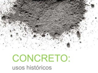 El documento describe brevemente los usos históricos del concreto y el cemento. Las culturas egipcia y griega usaban morteros de piedra caliza hace 2,500 y 500 años respectivamente. Los romanos mejoraron los morteros con la adición de ceniza volcánica. Joseph Aspdin patentó el cemento Portland en 1824. Posteriormente, inventores como Monier, Coignet y Hennebique desarrollaron el concreto reforzado con varillas de acero entre 1860-1890.