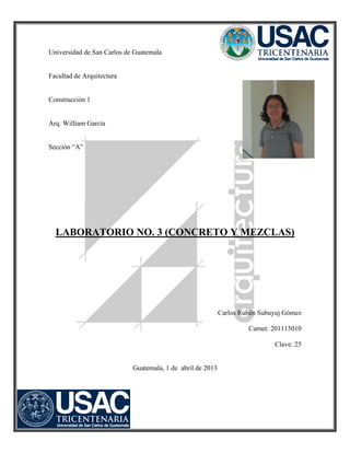 El documento trata sobre el concreto como material de construcción, destacando su composición, características, y tipos. Se abordan los procesos de mezcla, fraguado, y las propiedades mecánicas y físicas del concreto, así como su durabilidad y aplicaciones en obras. Además, se incluyen objetivos educativos relacionados con el conocimiento y uso del concreto en la arquitectura y construcción.