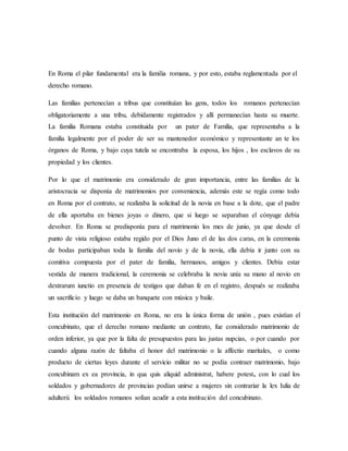 El documento resume el concubinato en la antigua Roma y su tratamiento en el derecho romano. En Roma, el concubinato era considerado un matrimonio de orden inferior al no cumplir con los requisitos del matrimonio legítimo. Los hijos de uniones concubinarias no tenían derechos de herencia y seguían la condición jurídica de la madre. Más tarde, el derecho de Justiniano concedió algunos derechos de herencia a concubinas e hijos naturales. El documento también analiza el tratamiento actual del