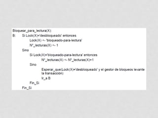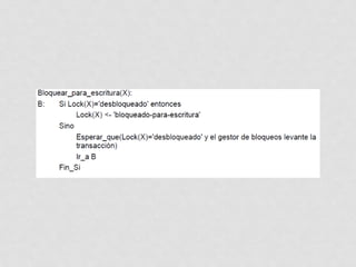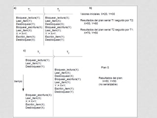 El documento describe diferentes técnicas de control de concurrencia para ejecuciones concurrentes de transacciones en una base de datos. Estas técnicas incluyen bloqueos binarios y de múltiples modos, protocolos de bloqueo de dos fases y basados en marcas temporales, los cuales permiten la ejecución concurrente de transacciones mientras se mantiene la consistencia de los datos.