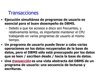 Los DBMSs soportan la concurrencia y la recuperación de fallos mediante transacciones ACID (atómicas, consistentes, aisladas y duraderas), registro de operaciones y la búsqueda de horarios equivalentes a la ejecución en serie. El protocolo de bloqueo de dos fases estricto (2PL) garantiza horarios serializables, mientras que el registro de escrituras anticipadas (WAL) permite deshacer operaciones abortadas y recuperar el sistema tras un fallo al estado consistente.