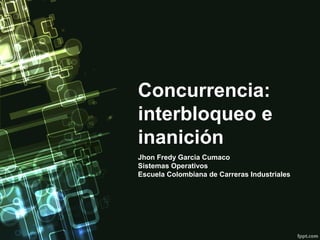 Este documento describe el interbloqueo y la inanición en sistemas concurrentes. Define el interbloqueo como el bloqueo permanente de un conjunto de procesos que compiten por recursos o se comunican entre sí. Explica que para que ocurra el interbloqueo se deben cumplir cuatro condiciones: exclusión mutua, posesión y espera, no apropiación, y espera circular. También incluye un ejemplo de interbloqueo en un cruce de cuatro caminos donde cuatro coches llegan al mismo tiempo y ninguno puede avanzar porque cada