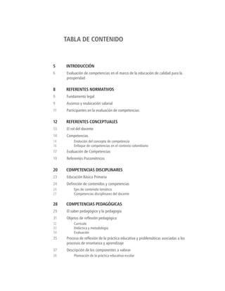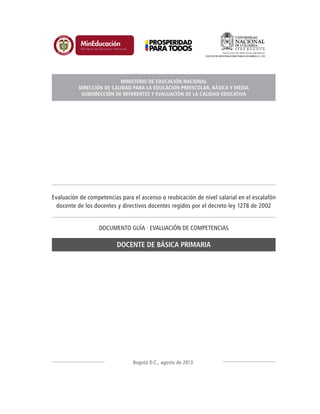 Este documento presenta los lineamientos para la evaluación de competencias de docentes y directivos docentes con el fin de ascensos o reubicaciones salariales. Explica los referentes normativos como la Constitución, la Ley General de Educación y el Estatuto Docente. Define el escalafón docente de tres grados y cuatro niveles cada uno. Para ascenso o reubicación se requiere titulo, evaluaciones satisfactorias y superar con 80% la prueba de competencias.