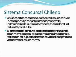 El documento describe el sistema concursal chileno para casos en que un solo acto constituye varios delitos. Explica los tipos de concurso (real, ideal y medial), su tratamiento legal y excepciones como la unidad jurídica de acción y el concurso aparente de leyes.