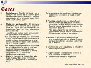 Este documento anuncia un concurso de lectura de la segunda parte de El Quijote organizado por el Departamento de Lengua Castellana y Literatura para conmemorar el IV centenario de su publicación. El concurso consistirá en que los alumnos de 2o y 3o de ESO respondan semanalmente a preguntas sobre la obra. Los ganadores participarán en una ruta literaria. Se incluyen las bases del concurso y dos ejemplos de preguntas planteadas.