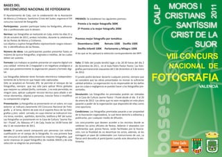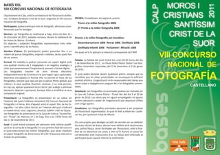 El documento describe las bases del VIII Concurso Nacional de Fotografía de las fiestas de Moros y Cristianos de Calp, Valencia. El concurso se llevará a cabo del 21 al 24 de octubre de 2011 durante las fiestas. Los participantes podrán presentar hasta 15 fotografías originales e inéditas. Habrá varios premios en efectivo por un total de 800€ y el fallo del jurado será el 2 de diciembre de 2011.