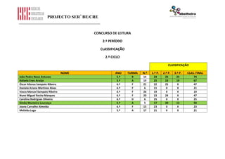 Este documento presenta los resultados de dos concursos de lectura para estudiantes de dos ciclos diferentes. En la primera sección, lista los nombres y notas de 8 estudiantes del 3er ciclo. En la segunda sección, hace lo mismo para 11 estudiantes del 2do ciclo. Finalmente, enumera a los 3 estudiantes premiados de cada ciclo, con sus nombres, cursos y puntuaciones finales.