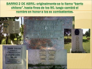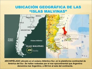 El documento describe brevemente la ubicación geográfica de las Islas Malvinas en el océano Atlántico Sur, cerca de la costa de Argentina. También menciona el enfrentamiento bélico entre Argentina y Gran Bretaña por la soberanía de las islas en 1982. Finalmente, señala que los ex combatientes de la localidad de Cañada de Gómez, Santa Fe, se reúnen todos los martes en la Plaza 2 de Abril y que se realizarán entrevistas a ex combatientes de la zona.
