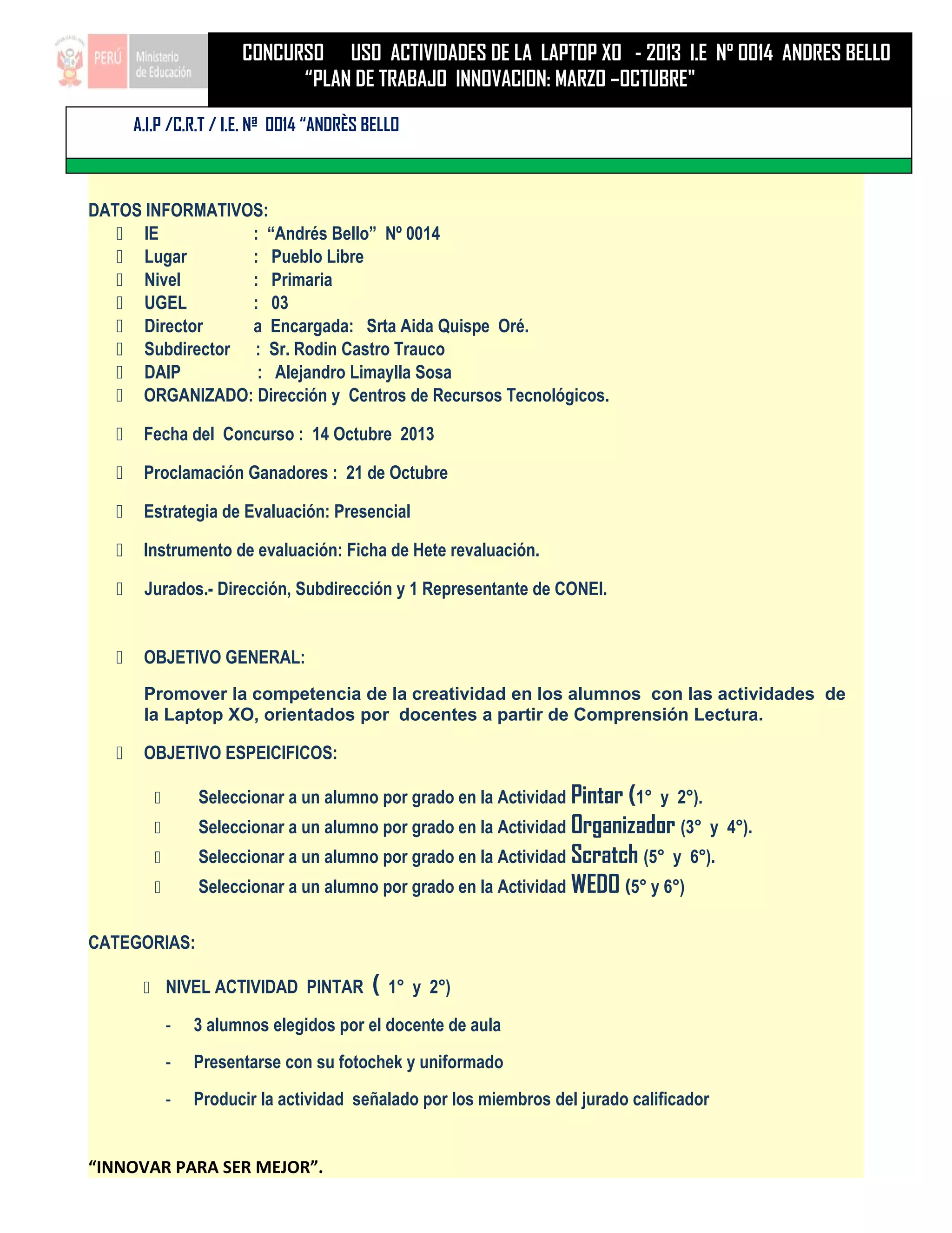 Este documento describe un concurso para promover el uso de computadoras XO y el portal PeruEduca en la escuela primaria "Andrés Bello" en Pueblo Libre. El concurso evaluará y premiará a los docentes y estudiantes en dos categorías: el uso de actividades en las computadoras XO y la participación en el portal PeruEduca. Se seleccionará a los ganadores basados en criterios como la elaboración y publicación de materiales educativos. El concurso tendrá lugar del 21 de septiembre al 18 de octubre de 2013.