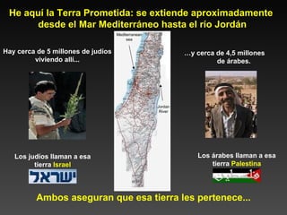 El documento presenta las perspectivas de israelíes y palestinos sobre sus reclamos a la Tierra Santa. Ambos pueblos tienen razones históricas, religiosas y culturales para considerarla como propia. La única solución viable es la creación de dos estados independientes, pero el proceso de paz fracasó debido a la intolerancia y la falta de confianza entre las partes. Se necesita combatir la propaganda simplista y trabajar hacia una solución de dos estados que garantice los derechos de ambos pueblos.