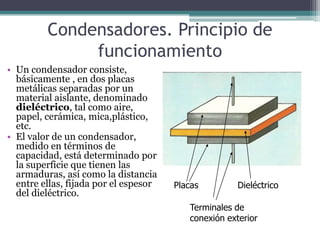 El documento detalla el funcionamiento y características de los condensadores, describiendo su estructura básica y cómo acumulan carga eléctrica al aplicar voltaje. Se exploran diversos tipos de condensadores, incluyendo cerámicos, de poliéster y electrolíticos, cada uno con sus aplicaciones específicas y propiedades. También se aborda el proceso de carga y descarga, así como la constante de tiempo asociada a este proceso.