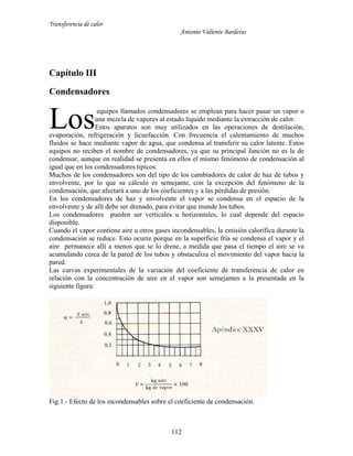 Este documento describe los diferentes tipos de condensadores y sus usos en la transferencia de calor. Explica que los condensadores se usan para hacer pasar un vapor al estado líquido mediante la extracción de calor. Luego presenta diferentes ecuaciones para calcular los coeficientes de transferencia de calor en la condensación en función de variables como la geometría, las propiedades de los fluidos y el régimen de flujo. Finalmente, analiza casos especiales como la condensación de mezclas de vapores.