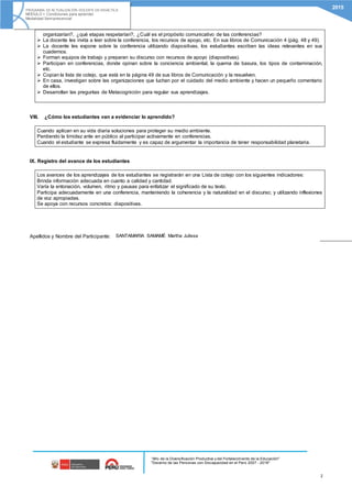 Este documento presenta una propuesta de práctica pedagógica para enseñar a los estudiantes sobre la importancia de proteger el medio ambiente a través de su participación en conferencias. La secuencia incluye ver un video sobre daños ambientales, analizarlo en grupo, aprender sobre la estructura de conferencias, y finalmente participar en una conferencia sobre conciencia ambiental donde practican sus habilidades comunicativas. El aprendizaje de los estudiantes será evaluado usando una lista de cotejo que mide su desempeño en la conferencia.
