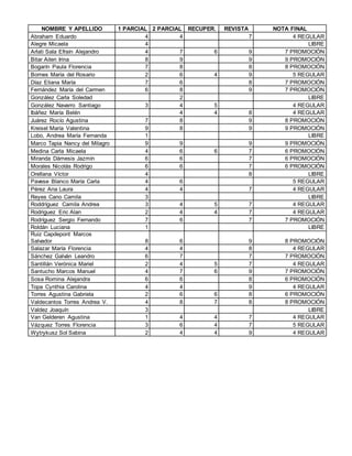 Este documento presenta los resultados académicos de varios estudiantes en diferentes asignaturas. Incluye el nombre completo de cada estudiante, las calificaciones obtenidas en dos parciales, una recuperación, una revista y la nota final, además de indicar si el estudiante fue promocionado, quedó en regular o libre.