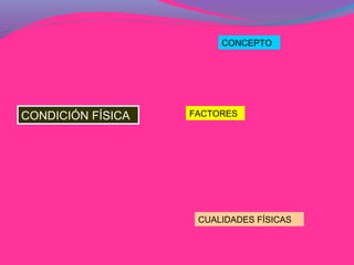 La condición física se refiere a la capacidad del cuerpo para realizar actividades cotidianas o físicas sin fatigarse demasiado ni lesionarse, y depende de factores como la fuerza, velocidad, resistencia y flexibilidad. Estas cualidades físicas pueden verse afectadas por factores modificables como el entrenamiento y hábitos de salud, e innatos como la edad, sexo y genética.