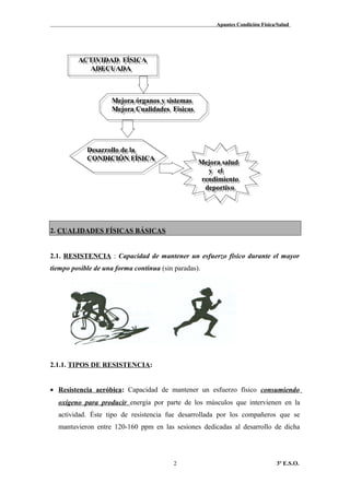 Este documento describe los conceptos de condición física y salud. Explica que la condición física se refiere a las cualidades necesarias para realizar esfuerzos físicos y que incluye cualidades físicas básicas como la resistencia, fuerza, flexibilidad, coordinación y equilibrio. También describe cómo realizar actividad física adecuada mejora la condición física y la salud al mejorar el funcionamiento de los órganos y sistemas. Finalmente, se enfoca en explicar la resistencia como cual