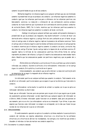El documento resume los fundamentos del condicionamiento operante establecidos por Thorndike a través de sus experimentos con gatos. Thorndike observó que los gatos aprendían a escapar de una caja para conseguir comida de forma más rápida a través de prueba y error, concluyendo que los comportamientos reforzados positivamente tienen más probabilidad de repetirse. El condicionamiento operante explica cómo los refuerzos, castigos e incentivos influyen en el comportamiento.