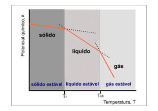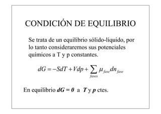 Este documento explica la condición de equilibrio para un sistema en equilibrio sólido-líquido. Indica que para el equilibrio, los potenciales químicos de las fases deben ser iguales. También discute cómo los potenciales químicos de las fases dependen de la temperatura y la presión.