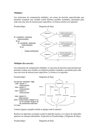 Las estructuras condicionales comparan una variable contra otro valor para determinar el curso de acción en un programa. Existen tres tipos básicos: simples, dobles y múltiples. Las simples tienen una sola condición, las dobles tienen dos opciones posibles, y las múltiples permiten comparar una variable contra múltiples resultados posibles y ejecutar instrucciones específicas para cada caso.