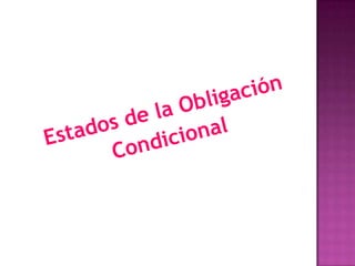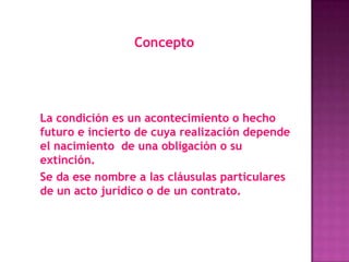 Este documento describe los conceptos clave relacionados con las condiciones en el derecho. Explica que una condición es un hecho futuro e incierto que determina si una obligación nace o se extingue. También cubre temas como condiciones múltiples, positivas, negativas, la posibilidad y licitud de las condiciones, y los efectos de las condiciones suspensivas y resolutorias.