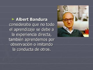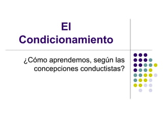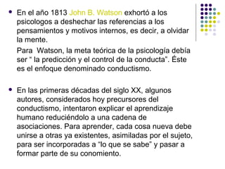 El documento resume las principales concepciones del conductismo sobre el aprendizaje. Explica que el conductismo se centra en la predicción y el control de la conducta observable en lugar de los procesos mentales internos. Describe los tres tipos de aprendizaje conductista: el condicionamiento clásico de Pavlov, el condicionamiento operante de Skinner y el aprendizaje por observación de Bandura. El aprendizaje ocurre a través de la asociación de estímulos, el refuerzo y el castigo de conductas, y la imitación de otros.